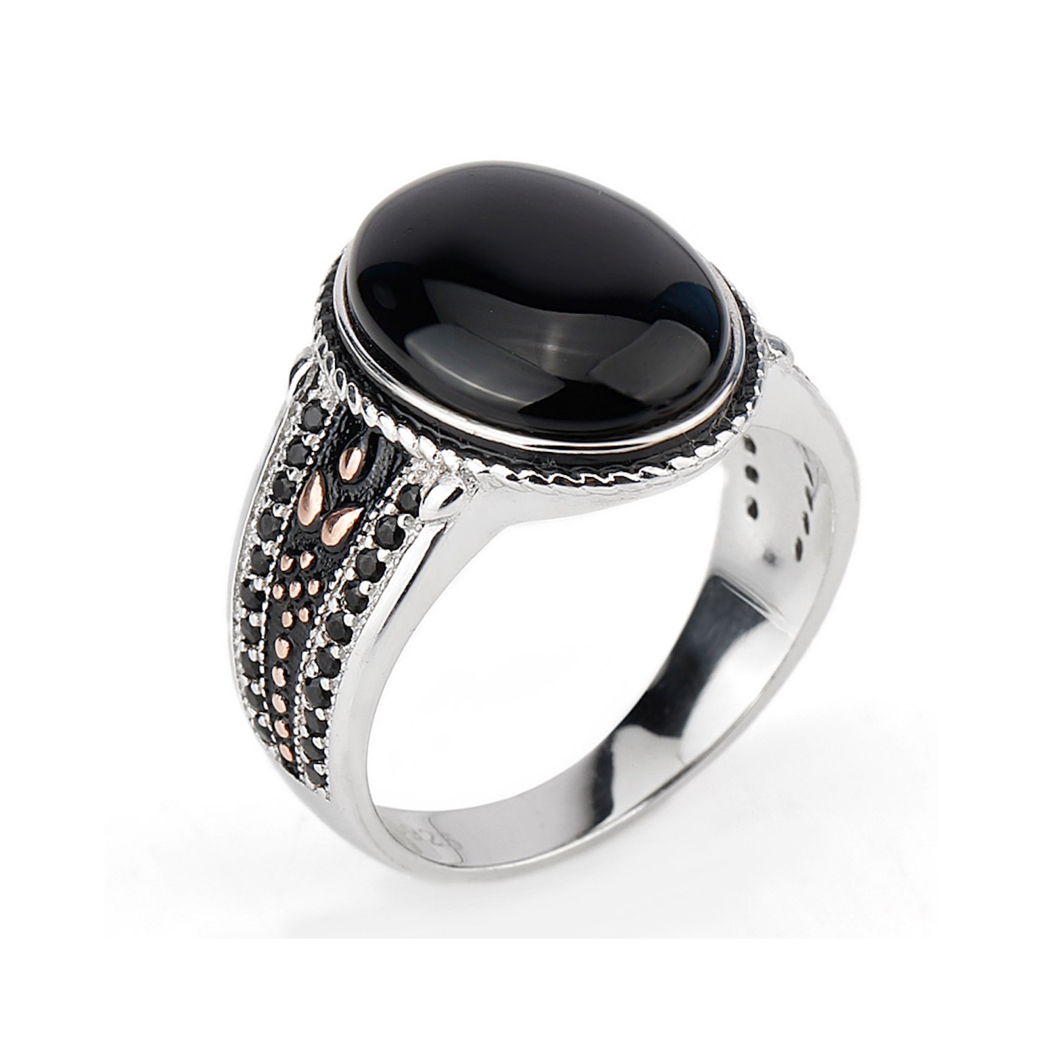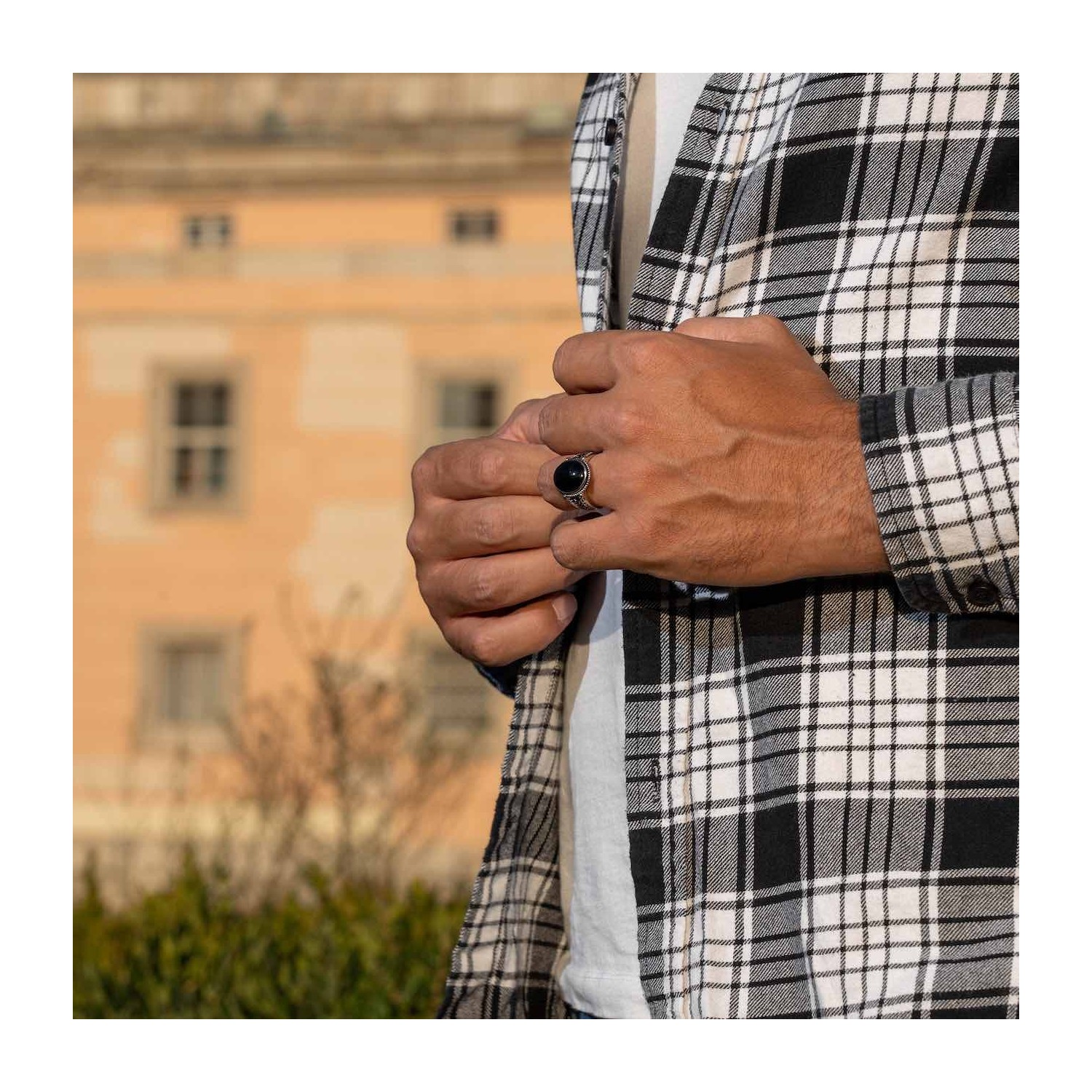 Men Women Silver Ring 925% With Engraving Black Agate Stone