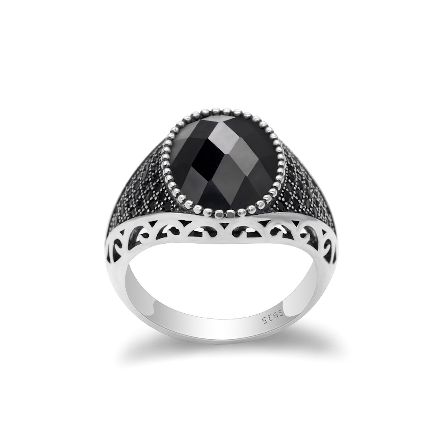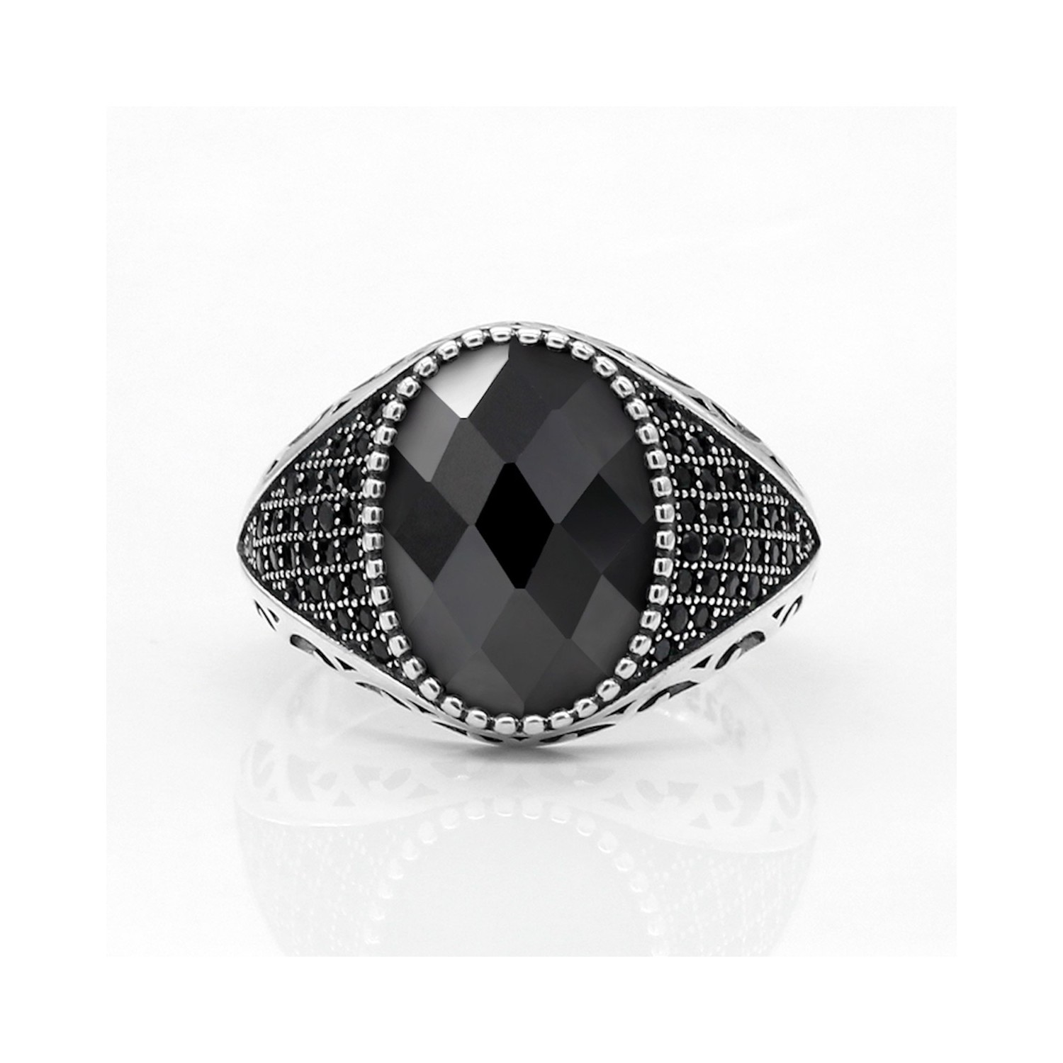 Men's Women's 925% Silver Chevalier Ring Faceted Black Stone