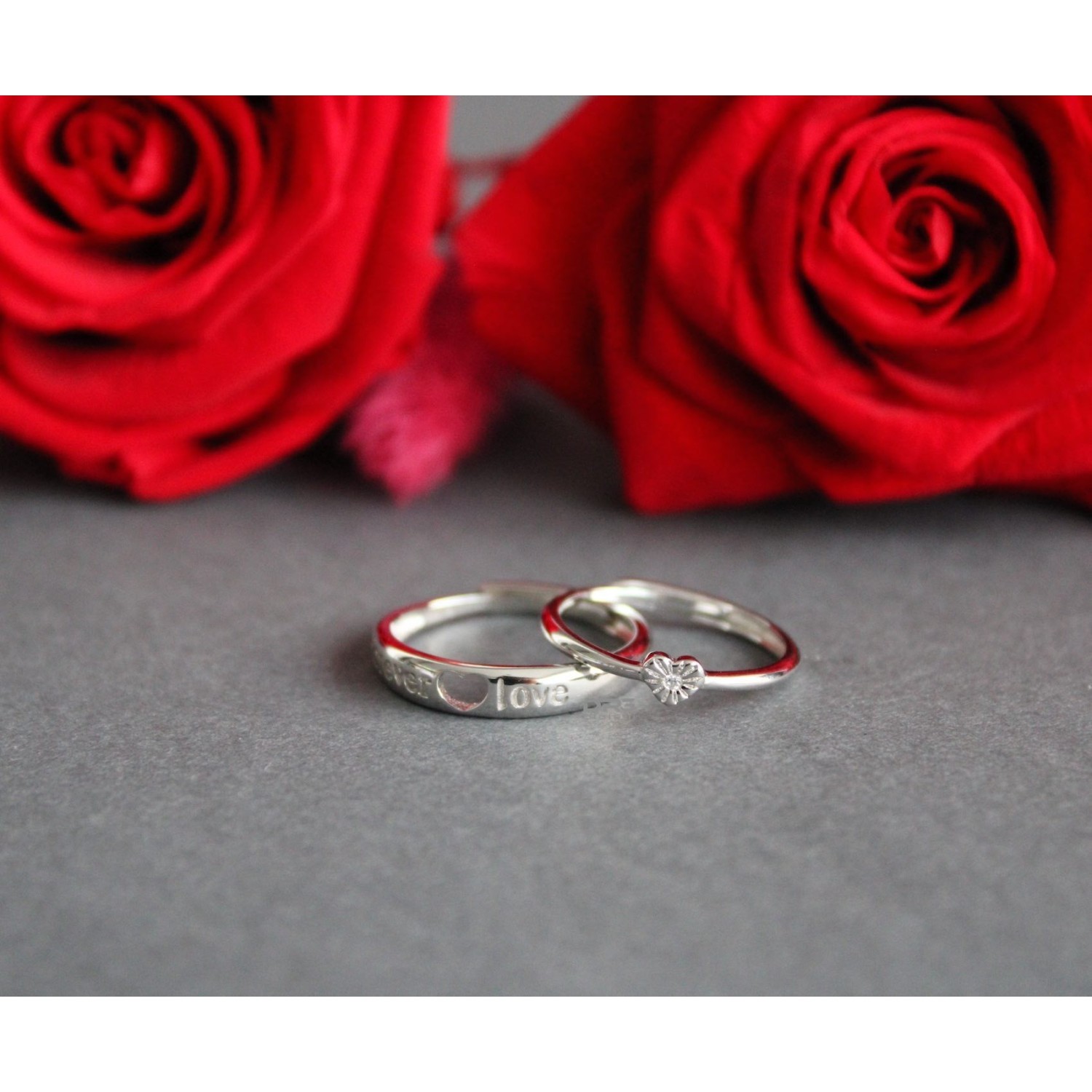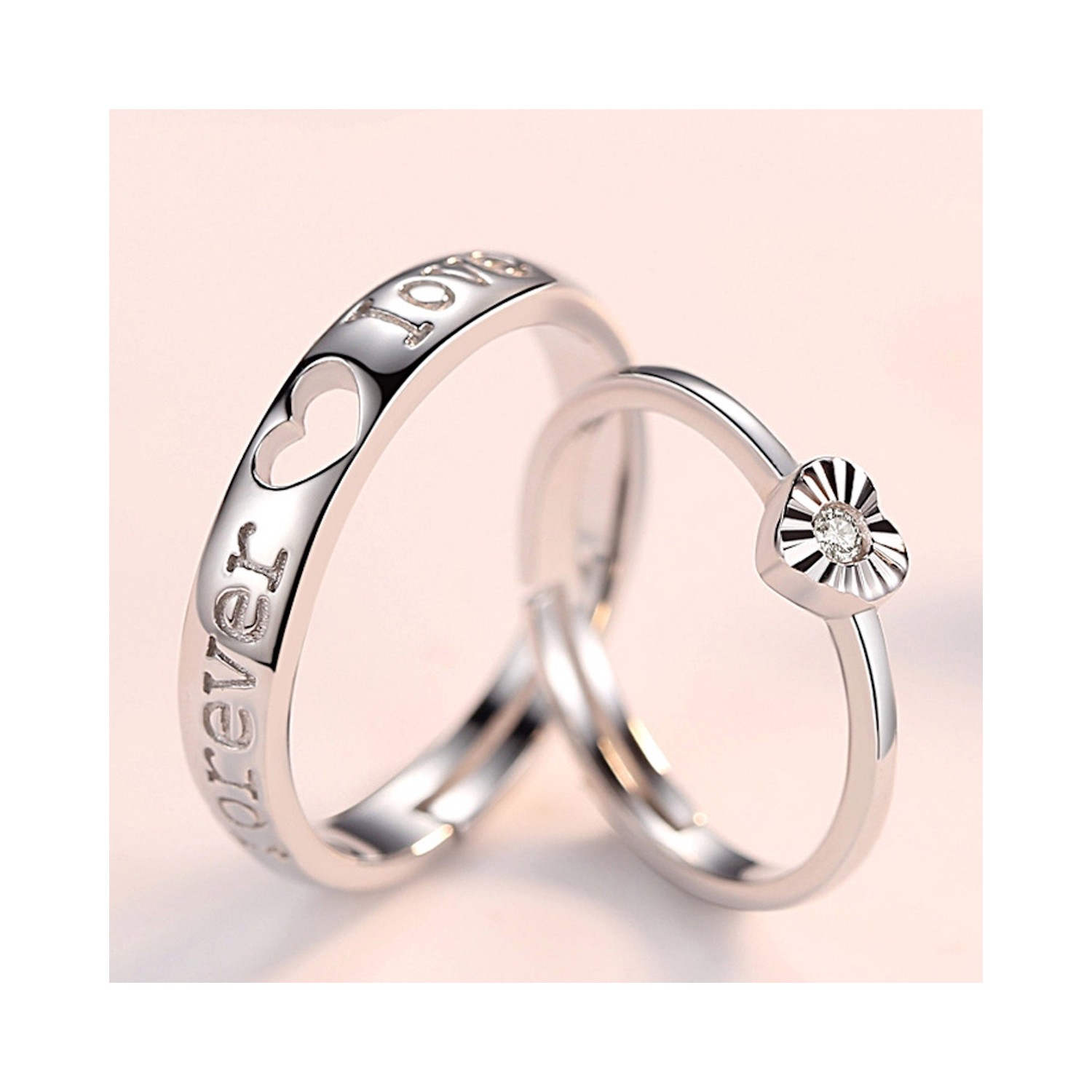 Couple of Adjustable Silver Rings for Men and Women with Heart-Shaped Zirconia