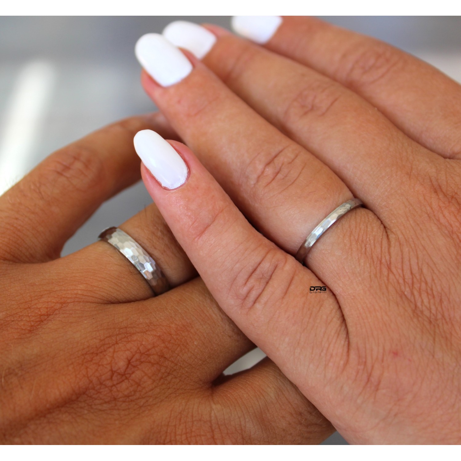 • Pair of stainless steel rings with hammered bands, both in Black