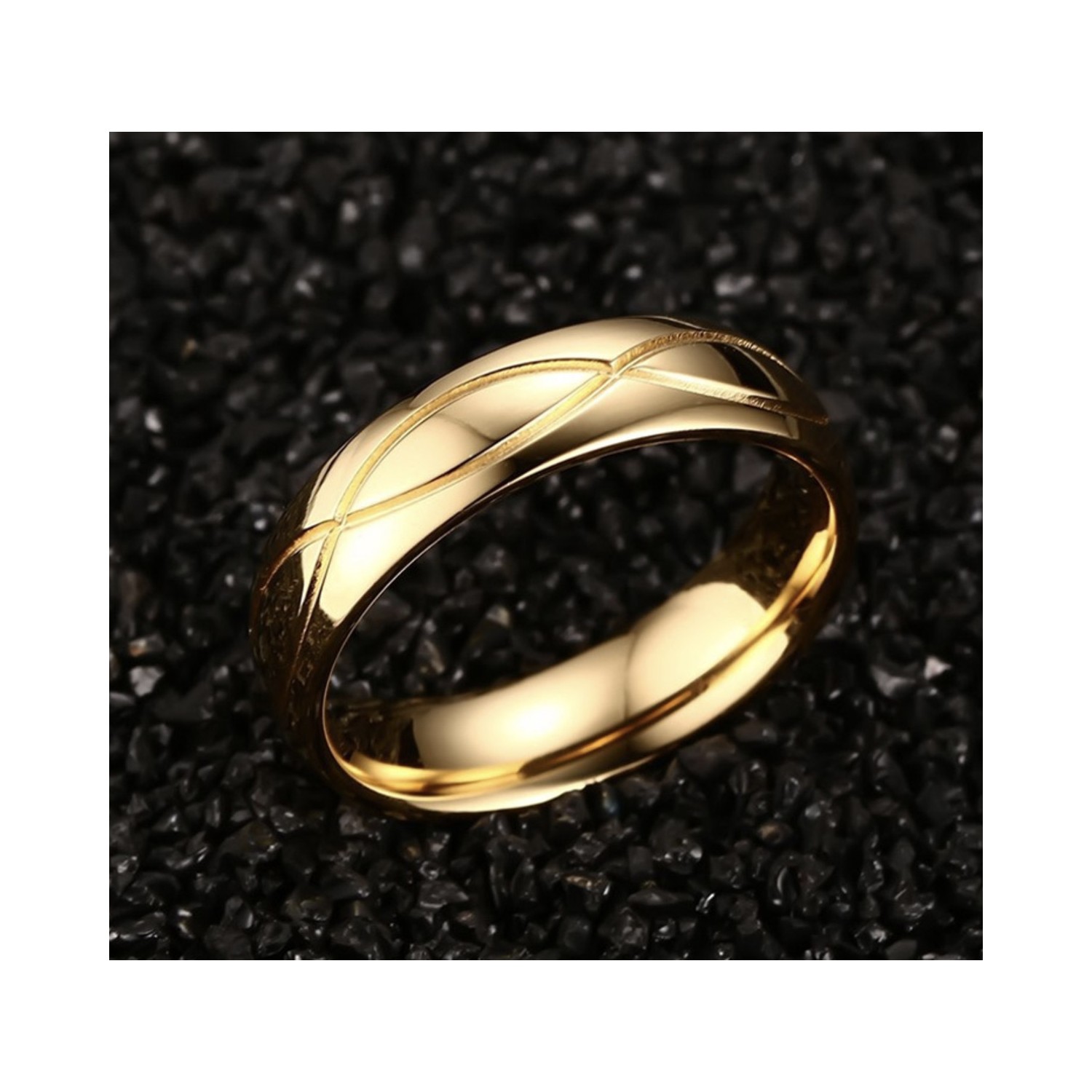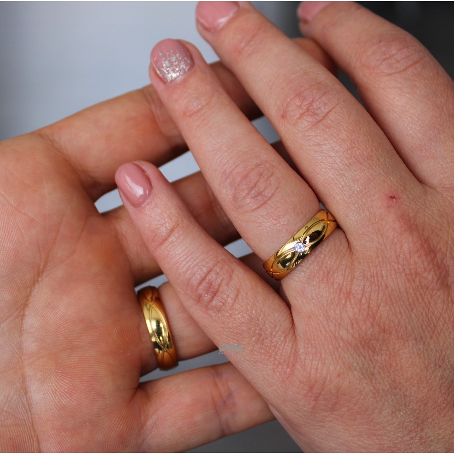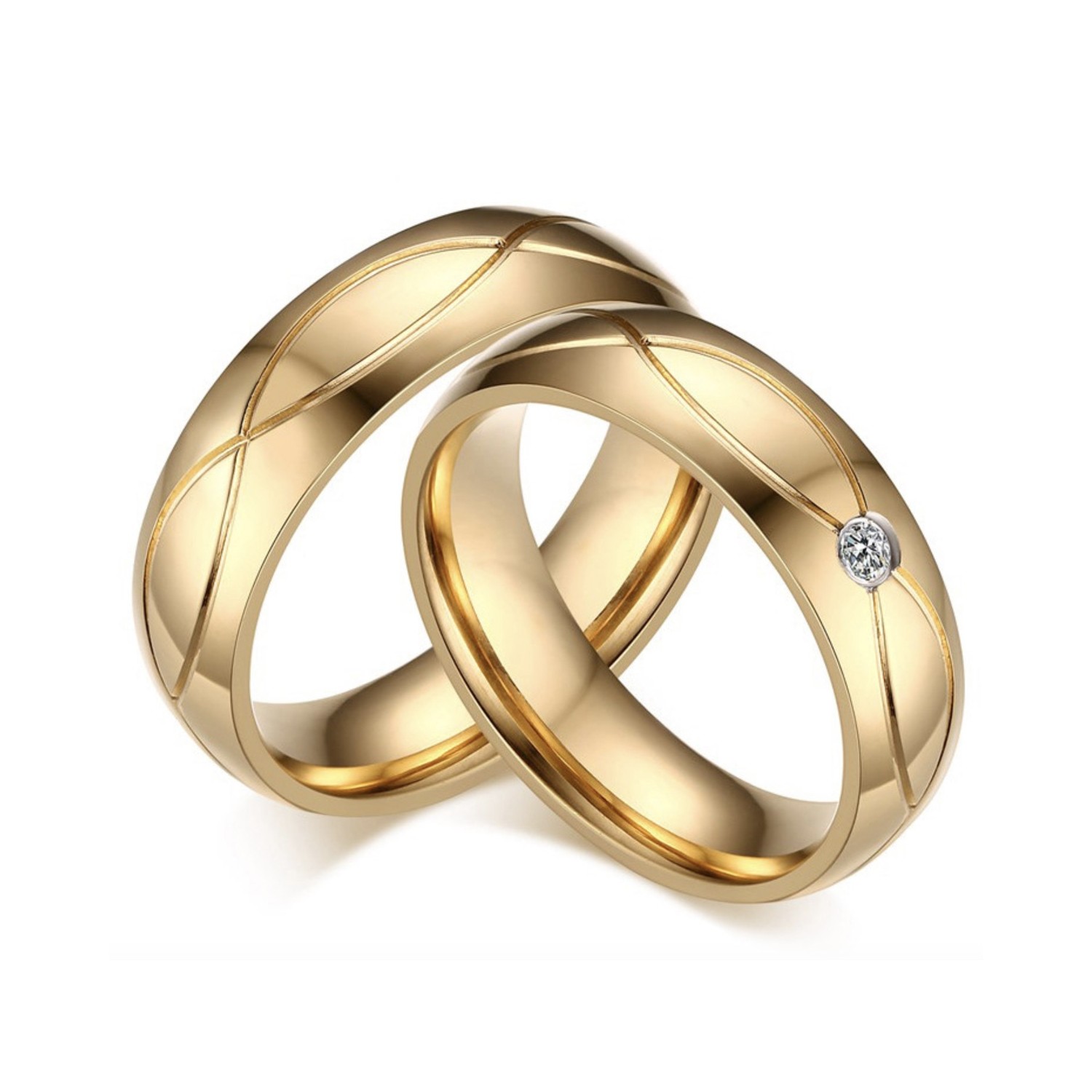 • Pair of Stainless Steel Rings with Gold-colored band and engraved embroidery on the outside